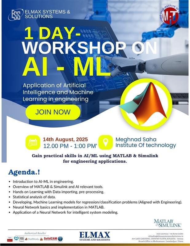 This is to inform all students that ELMAX Systems & Solutions, in association with Meghnad Saha Institute of Technology, is organizing a 1-Day Workshop on the Application of Artificial Intelligence and Machine Learning in Engineering on 14th August 2025 from 12:00 PM to 1:00 PM at the institute premises.